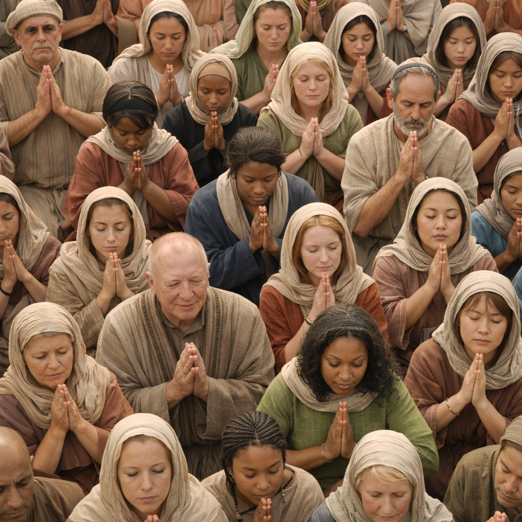 Далеко внизу виднелся большой храм. Храм весь был полон народом. Молящихся было очень много, разных возрастов и положений: мужчины и женщины, старики и дети, купцы и простые крестьяне. Все они кланялись, многие что-то говорили, но ничего не было слышно. Вся церковь была словно немая.