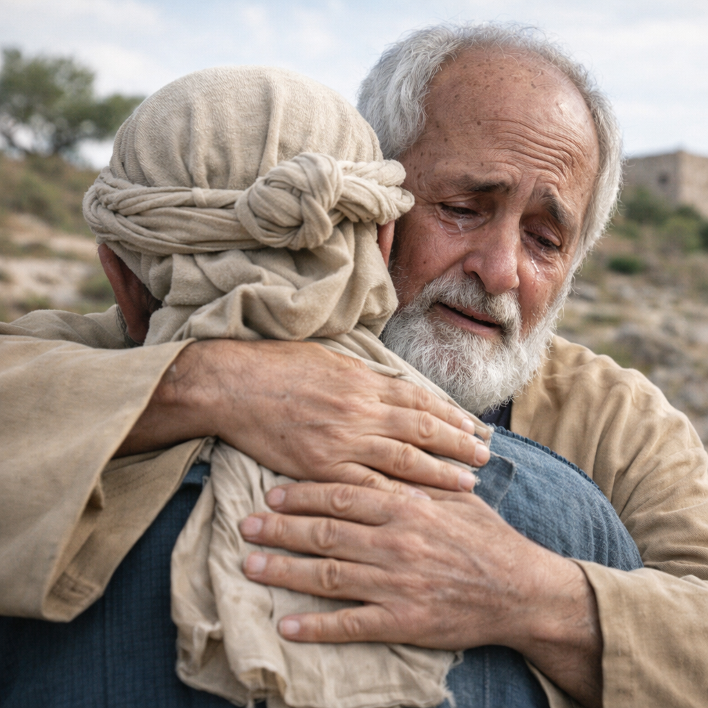 Жили-были отец и два сына. Старший был послушным, а младший — непокорным. Однажды младший сын забрал у отца свою долю наследства и пустился в странствия. Скоро он попусту растратил все деньги и остался в нищете. Возвращаться к отцу ему было стыдно, и он нанялся в батраки, ухаживать за свиньями. Хозяева держали его впроголодь, так что даже свиное пойло казалось ему лакомством. И вот наконец юноша подумал: «У моего отца самый последний слуга живёт лучше, чем я здесь! Конечно, я очень виноват перед ним и не могу больше быть его сыном. Так пойду, попрошу прощения и наймусь к нему в работники! Может быть, он согласится принять меня», И он отправился домой. Но отец, едва увидев его, бросился навстречу и крепко обнял. Затем он приказал слугам принести для сына дорогую одежду и готовить пир, чтобы отпраздновать его возвращение. Старший брат было обиделся, что отец радуется младшему больше, чем ему, но отец ответил: